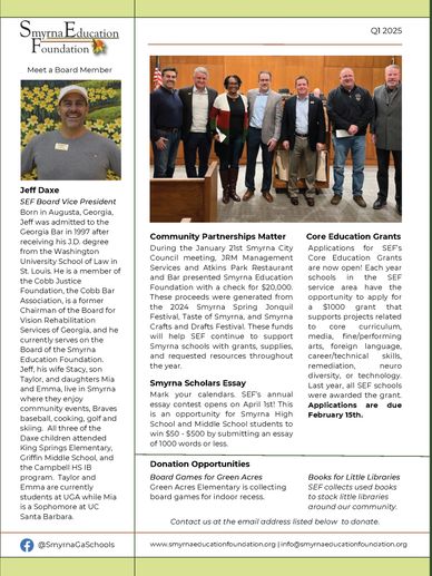 As part of the SEF mission to promote public education in Smyrna, SEF partners with the Campbell High School (foundation?) to produce a two page spread in the local Brightside Newspaper. The article, printed annually in October, highlights student achievements for the previous school year. #SpartanProud